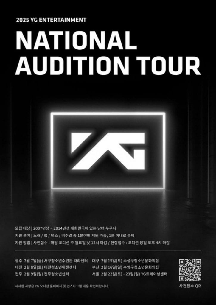 YG Entertainment, K-pop’un geleceğini şekillendirecek yeni yetenekleri keşfetmek için ‘2025 YG NATIONAL AUDITION TOUR‘ programını başlattığını duyurdu. 7-23 Şubat tarihleri arasında altı şehirde yedi seçme turu düzenlenecek.