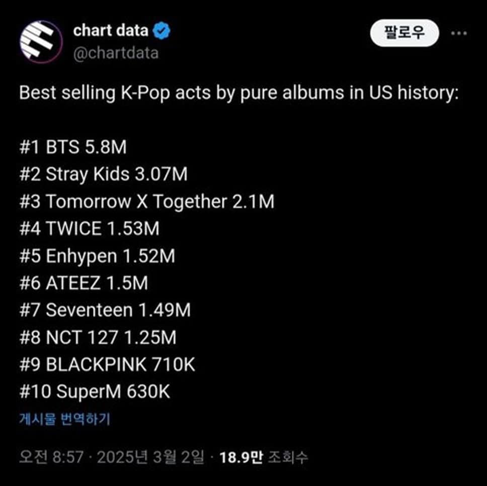 Son yıllarda K-Pop, sektördeki en önemli türlerden biri olarak konumunu sağlamlaştırdı ve birçok K-Pop sanatçısı ABD pazarına girdi. Satışlar açısından, birkaç K-Pop sanatçısı, özellikle dinlenme sayıları dahil edilmeden fiziksel albüm satışlarına atıfta bulunarak, saf albüm satışlarında rekorlar kırdı.