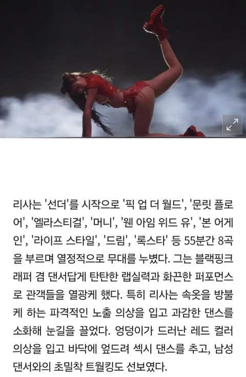 Özellikle iç çamaşırını andıran cesur kıyafeti ve cüretkar koreografisiyle dikkat çekti. Sırtını açıkta bırakan kırmızı bir kostüm giyen Lisa, yerde yatarak seksi bir dans performansı sergiledi ve erkek dansçıyla yakın temaslı twerk hareketleri yaptı.