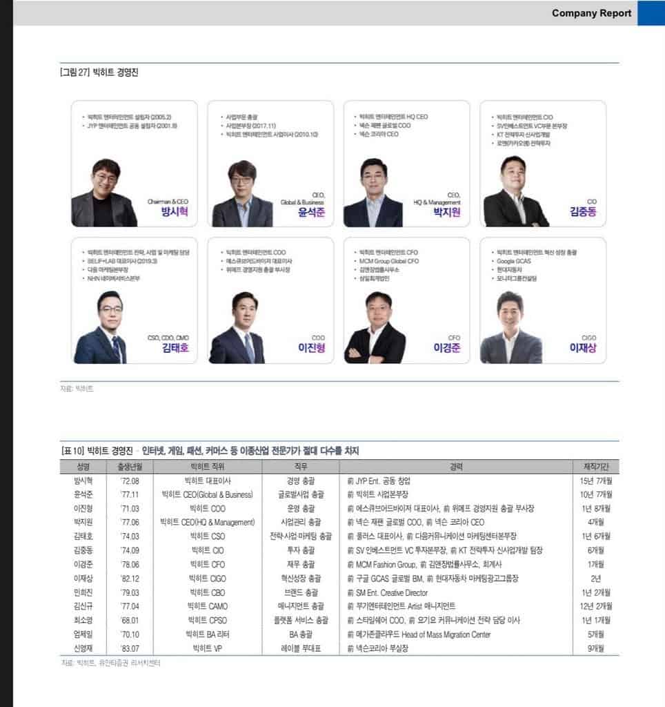 BigHit‘in üst düzey yöneticilerinin çoğunluğu internet, oyun, moda ve ticaret gibi çeşitli sektörlerde uzman kişilerden oluşuyor: