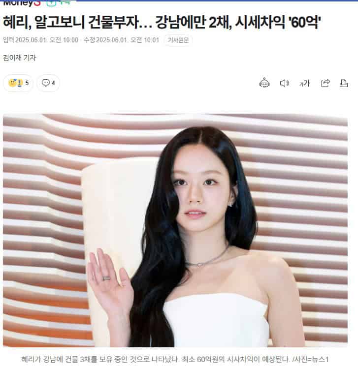 Girl’s Day‘in eski üyesi, şarkıcı ve oyuncu Hyeri‘nin Seul Gangnam’ın lüks semtleri Samseong-dong ve Yeoksam-dong’da iki binaya sahip olduğu ortaya çıktı. Toplam satın alma bedeli yaklaşık 12.1 milyar won (yaklaşık 8.9 milyon dolar) olan binalardan en az 6 milyar won (yaklaşık 4.4 milyon dolar) değer artışı kazancı elde etmesi bekleniyor.