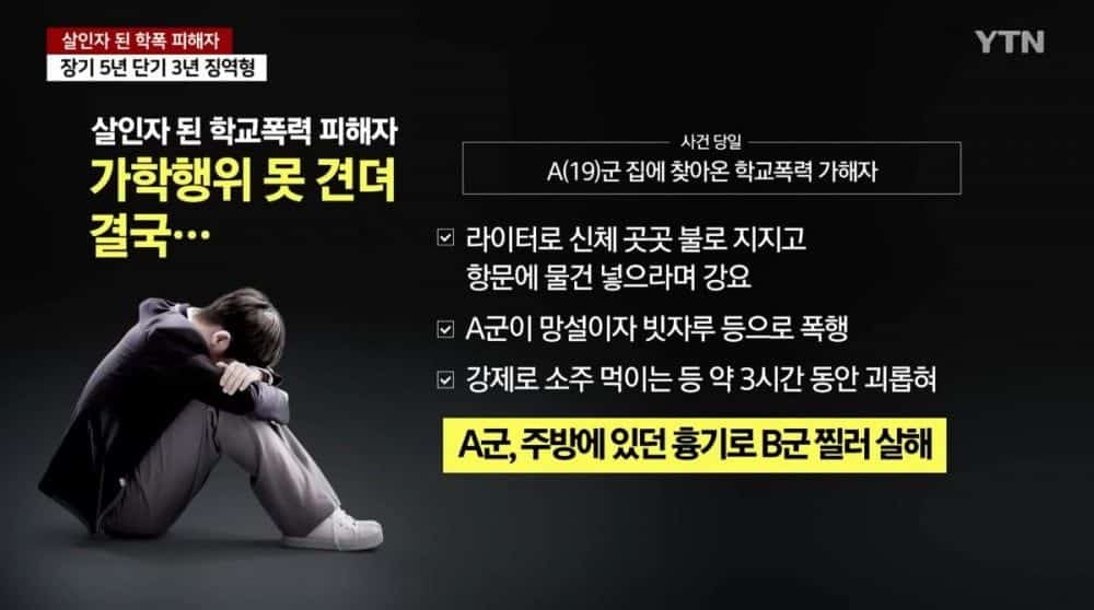 Bu yılın Şubat ayında, bir temyiz mahkemesi Seoul İlçe Mahkemesi’nin okul zorbasını öldürmekten yargılanan genç sanığa verdiği 3 yıl hapis cezasını bozdu. Bunun yerine Seoul Yüksek Mahkemesi, sanık ‘A’ (20) için 5 yıllık denetimli serbestlik (denetimli serbestlik süresinde başka bir suç işlenmesi durumunda 2 yıl hapis), 5 yıl gözetim ve ruh sağlığı tedavisi cezası verdi.
