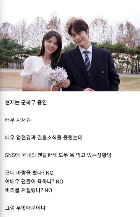 Şu anda askerlik görevini yapan oyuncu Cha Seowon, oyuncu Uhm Hyunkyung ile evleneceğini duyurdu ancak hem yerli hem de uluslararası hayranlar tarafından sosyal medyada eleştirildi.
