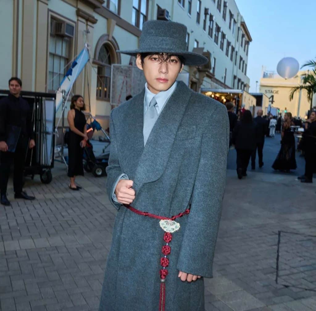 Uzun gri bir palto ve üzerinde kırmızı dokuma bir kemer vardı. Norigae (geleneksel Kore aksesuarları, uğur tılsımı olarak kullanılır) ile süslenmişti. Geniş kenarlı bir şapka ve şık deri ayakkabılarla tamamlanan V, paltosunu, uyumlu bir kravat ve açık gri bir gömlekle, özel dikim ama rahat gri bir takım elbisenin üzerine giydi.