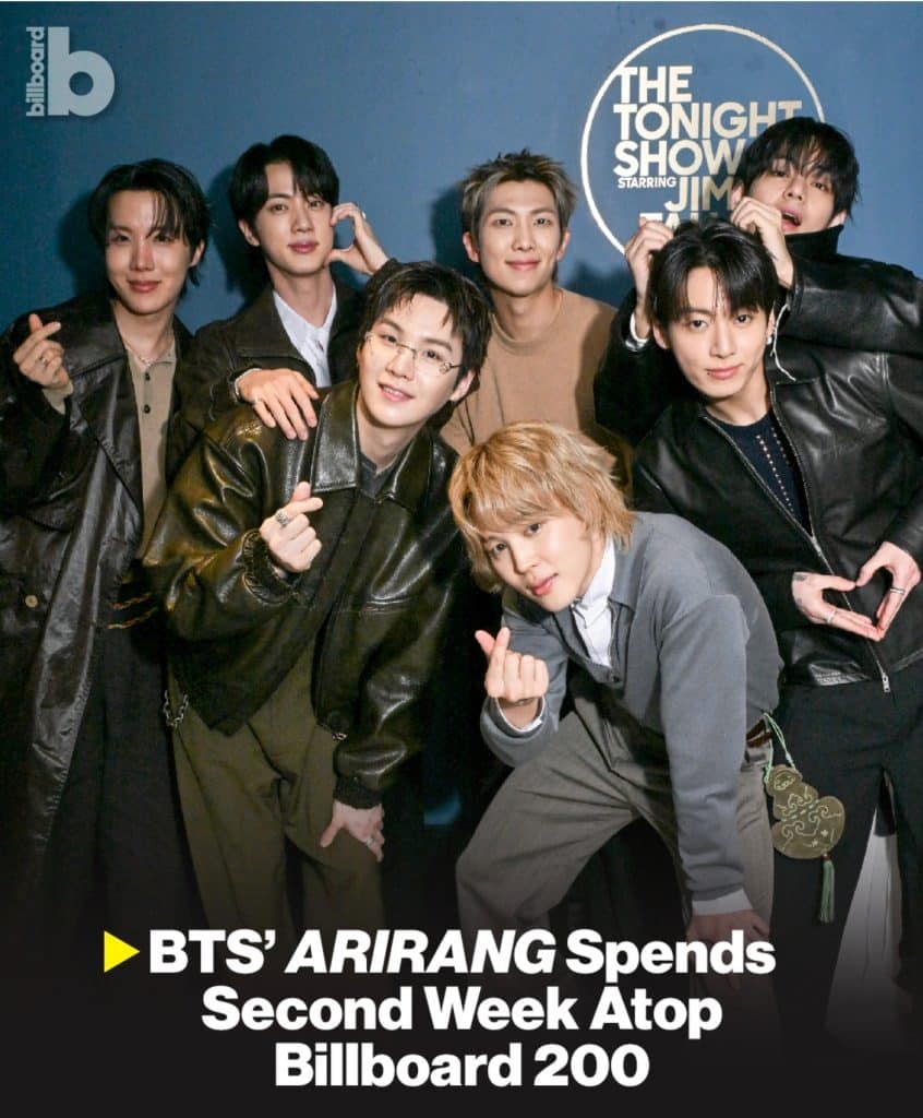 5 Nisan yerel saatinde Billboard, geçen hafta Billboard 200 listesinde 1 numaraya yükselen ve bugüne kadar bir Koreli sanatçının albümü için en büyük haftalık satış başarısını elde eden ARIRANG albümünün, listede 2. haftasını da zirvede geçirdiğini duyurdu.