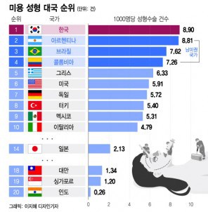 En çok plastik cerrahi uygulanan ülkelerin sıralaması Birim: 1000 kişide ameliyat olan kişi sayısı Kore – #1 ABD – #6 Japonya – #14 Çin – Sıralamada değil Kore, 1000 kişi