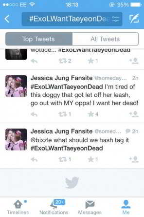 Exo-L’lerin ve Jessica fanlarının adını kullanarak resmen Taeyeon’a olan nefretlerini kustular. Kimi boğazını kesen bir kızın videosunu atıp buradaki Taeyeon olmalıydı dedi, kimisi de küfür ederek onun ölmesini istedi.